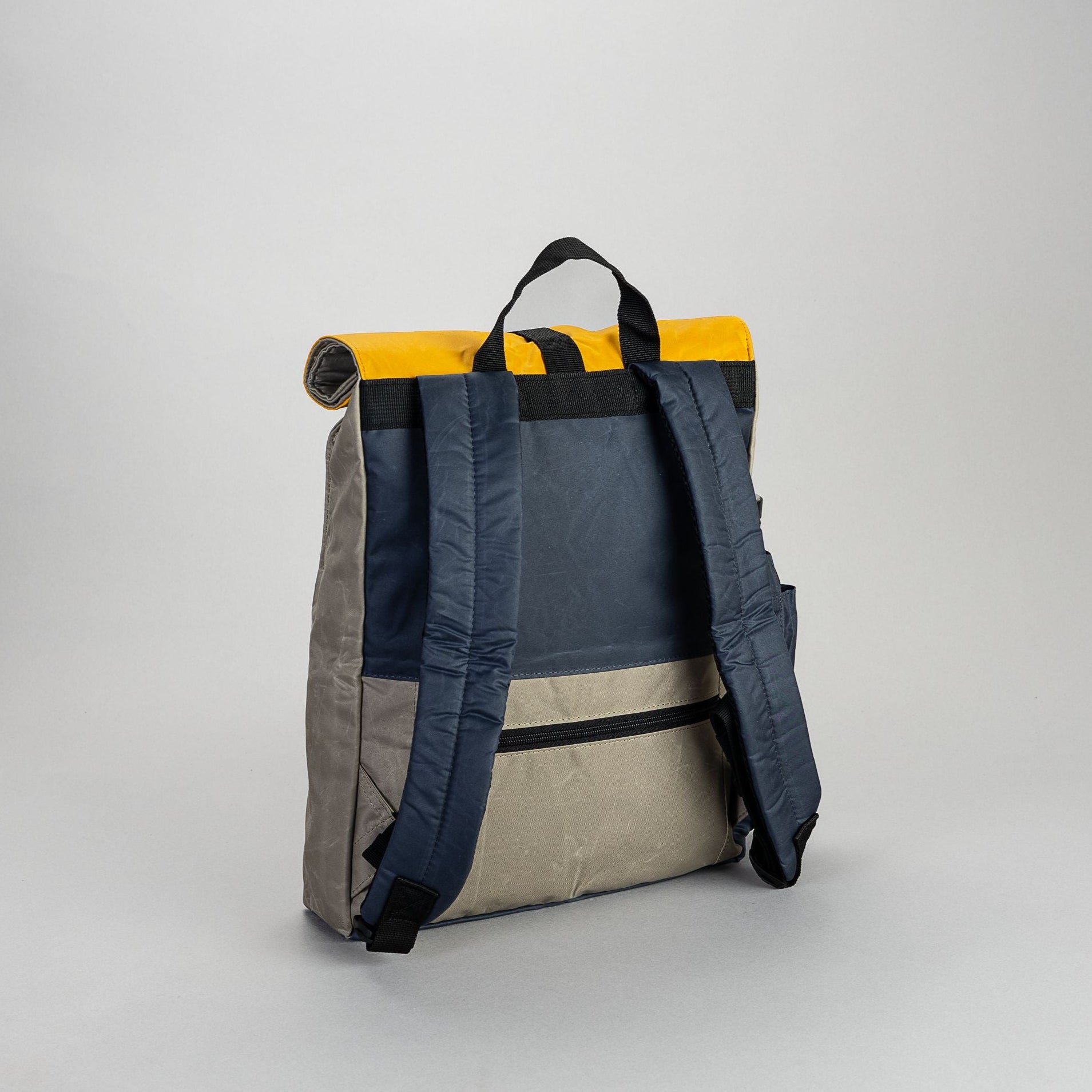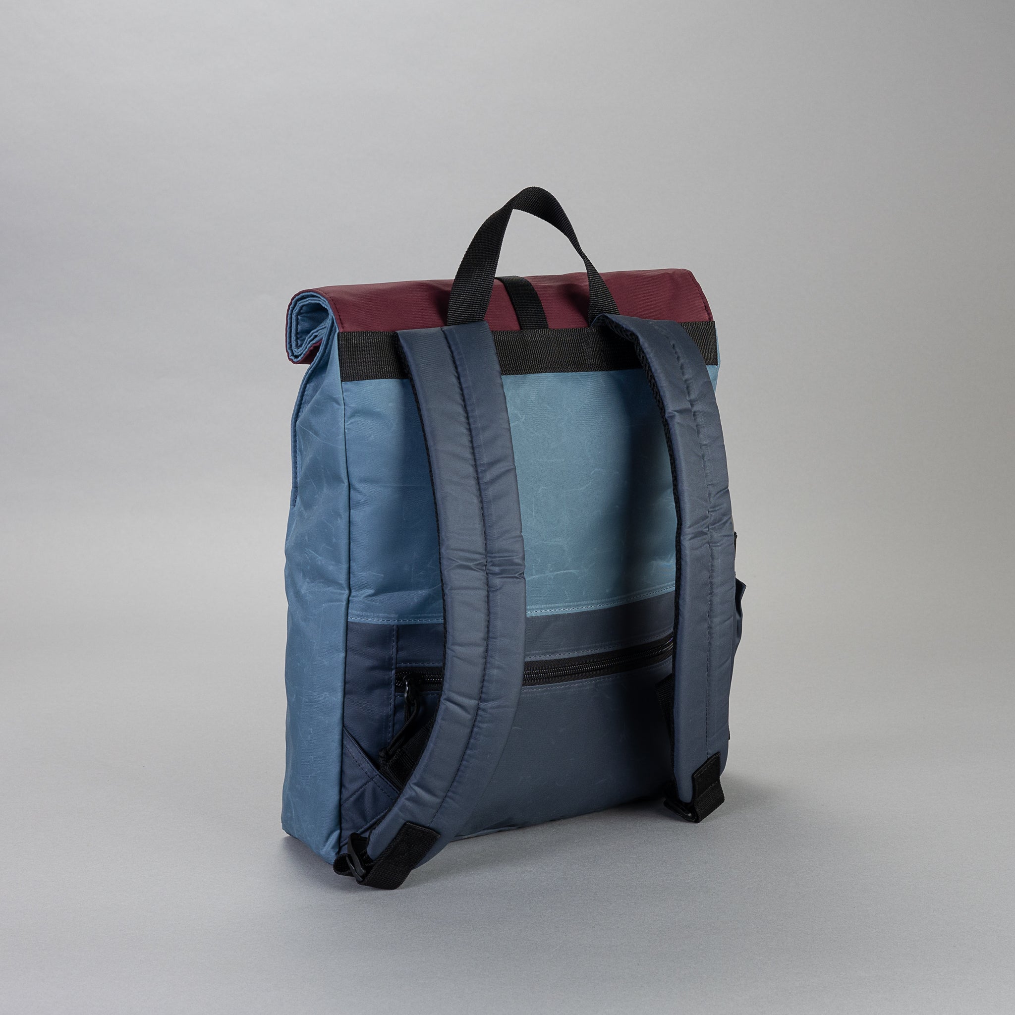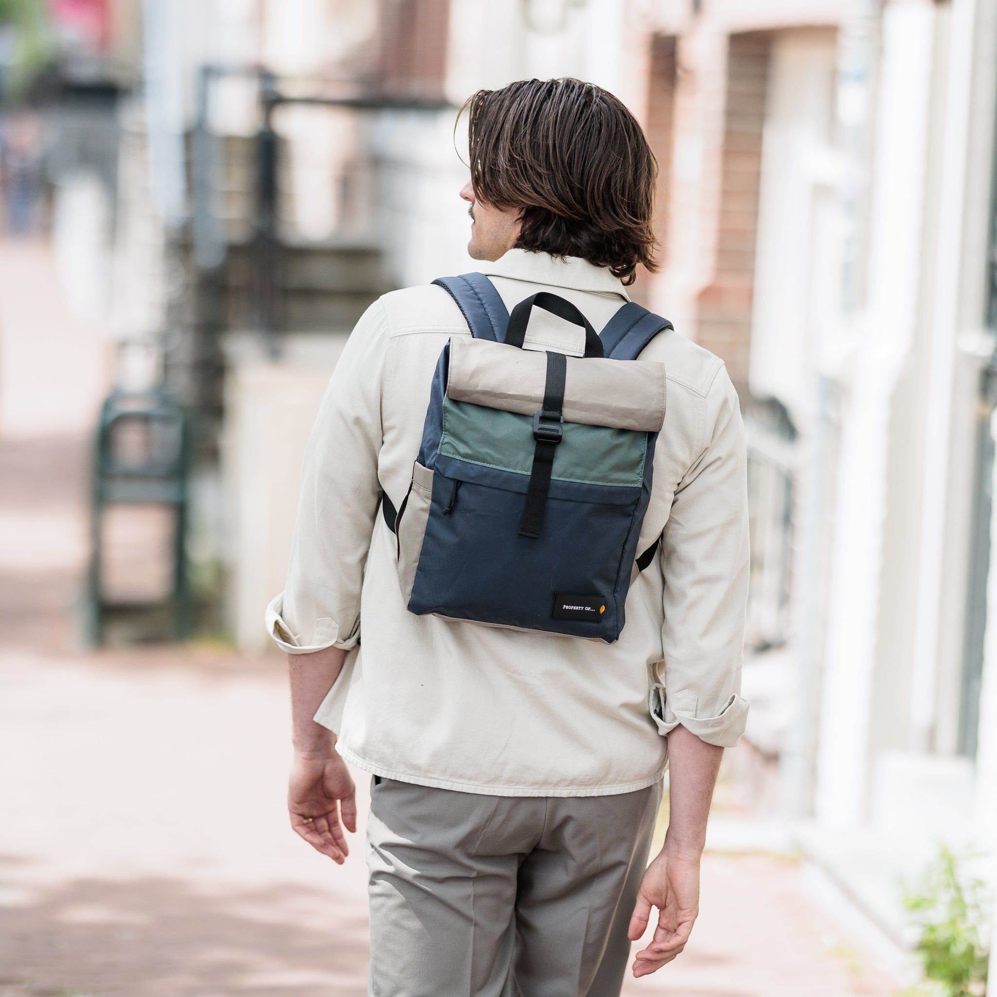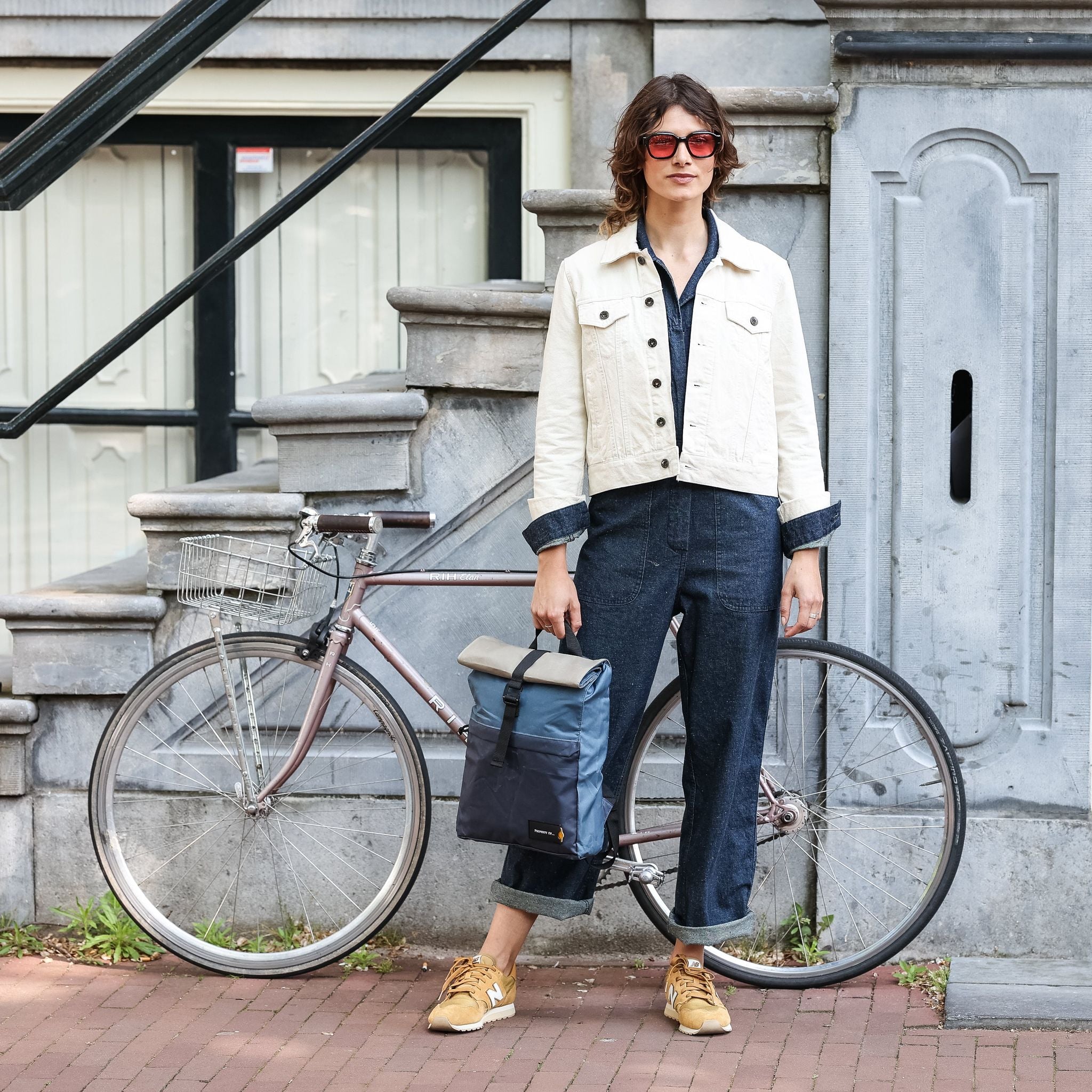 The fabric is made for 100% from recycled PET bottles and woven as a twill which makes it extra strong. The wax layer on the fabric gives it a nice patina.