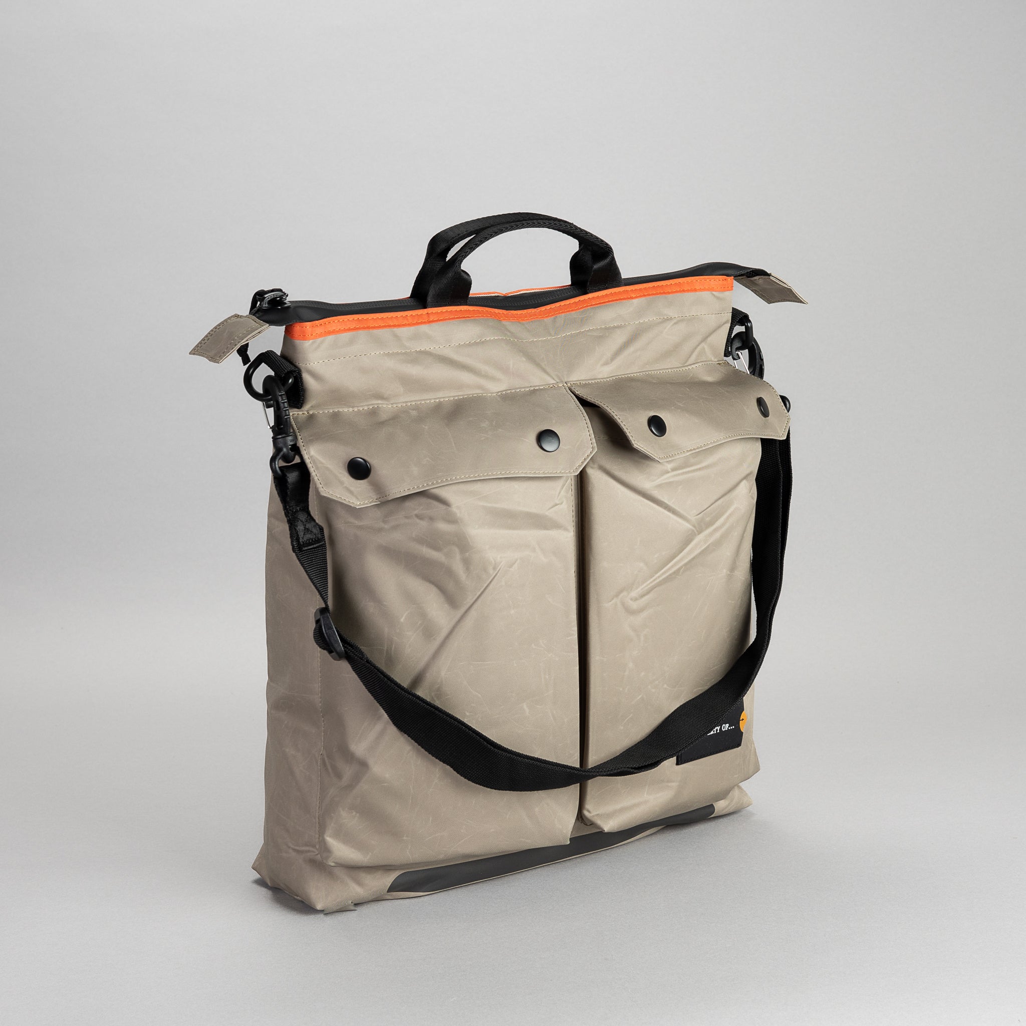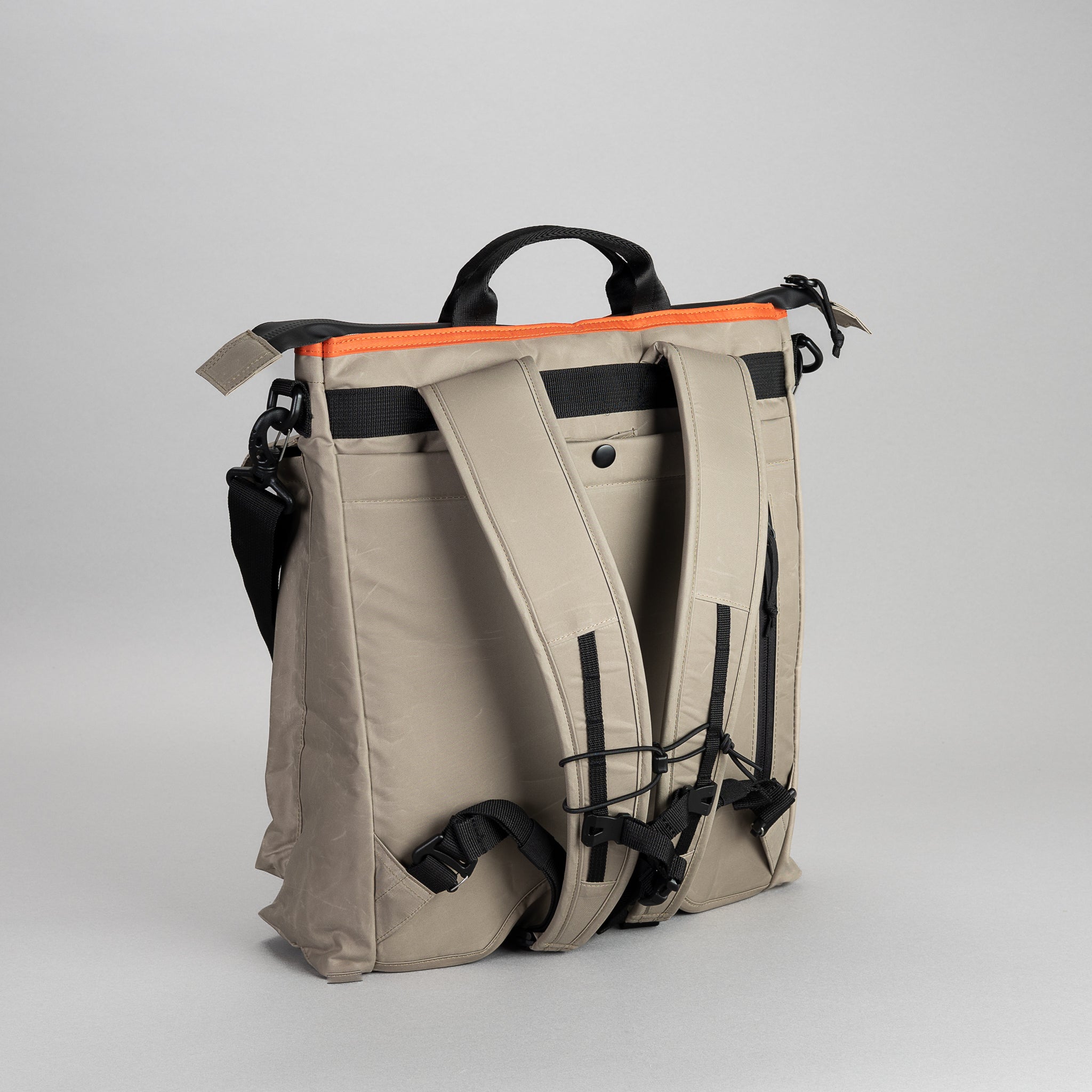 The Zoe Brompton Bike Pack is a 3-way bag that can be used as a backpack, handheld tote bag or over the shoulder shopping bag. The design is inspired by vintage pilot helmet bags that pilots used to carry their helmets and maps in. It consists of a big main compartment with a 16" padded laptop compartment, 2 outside front pockets and one big outside back pocket with a trolley function.