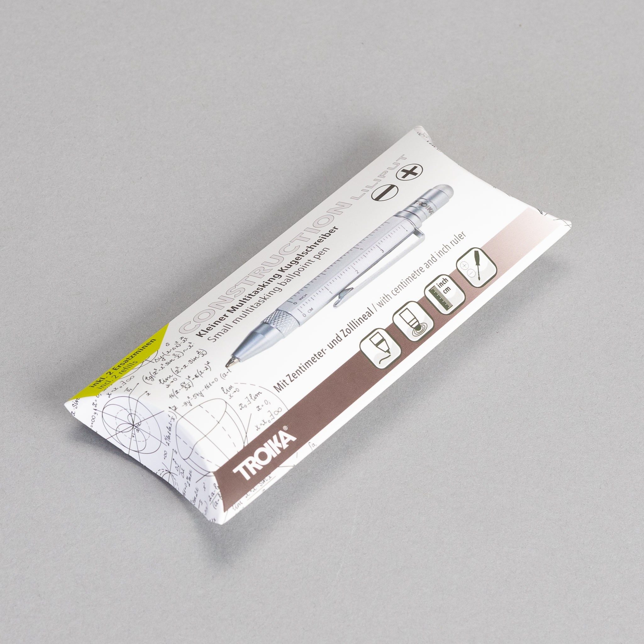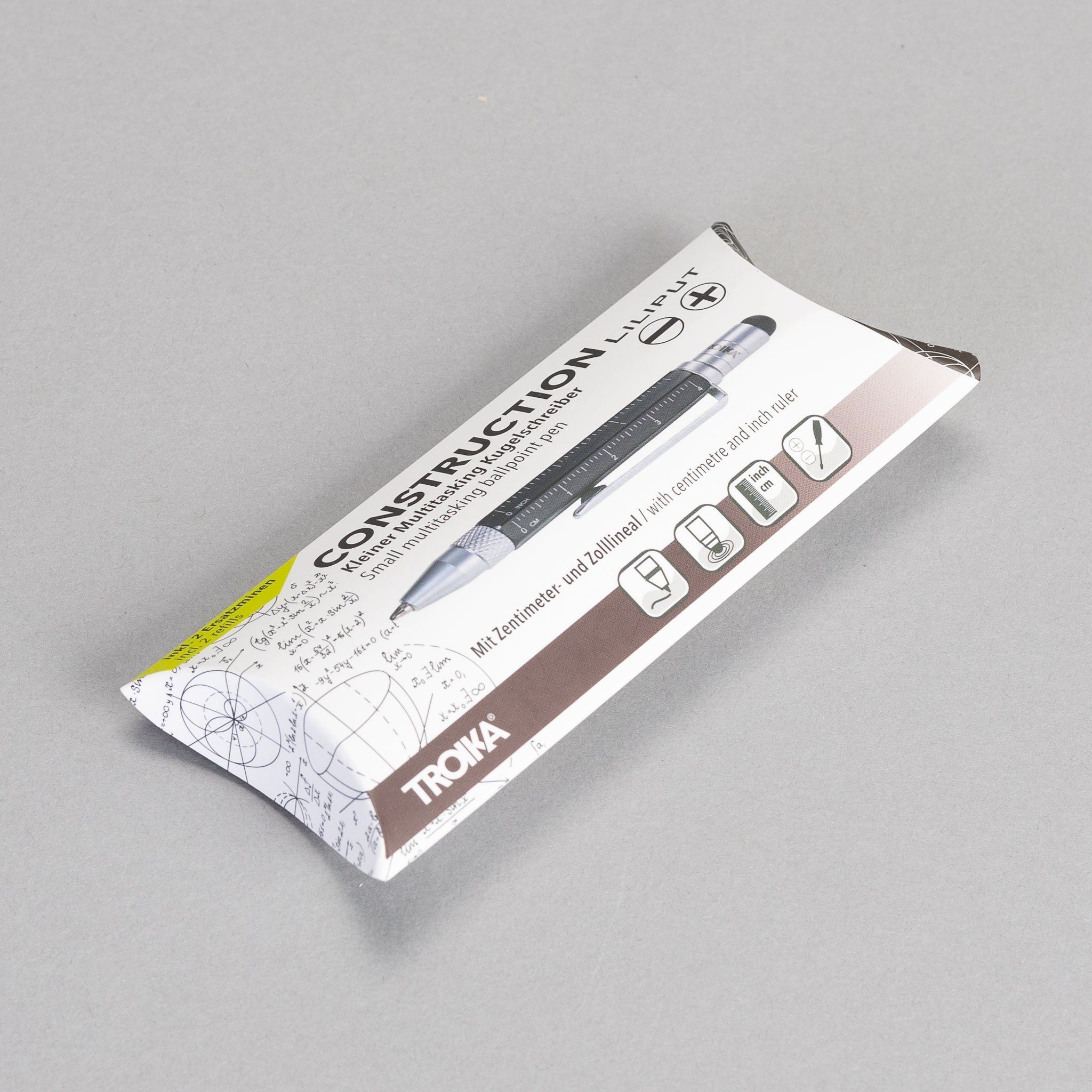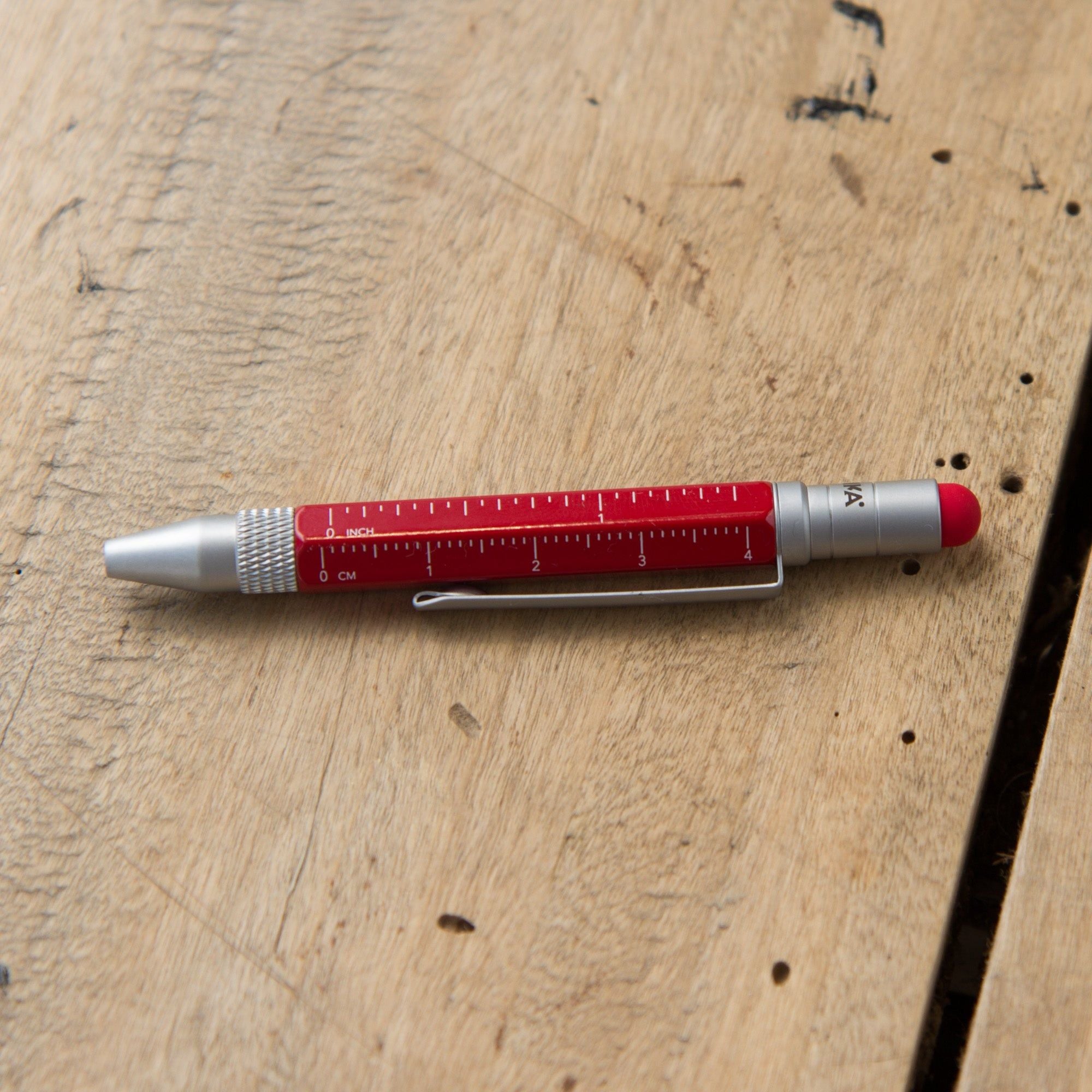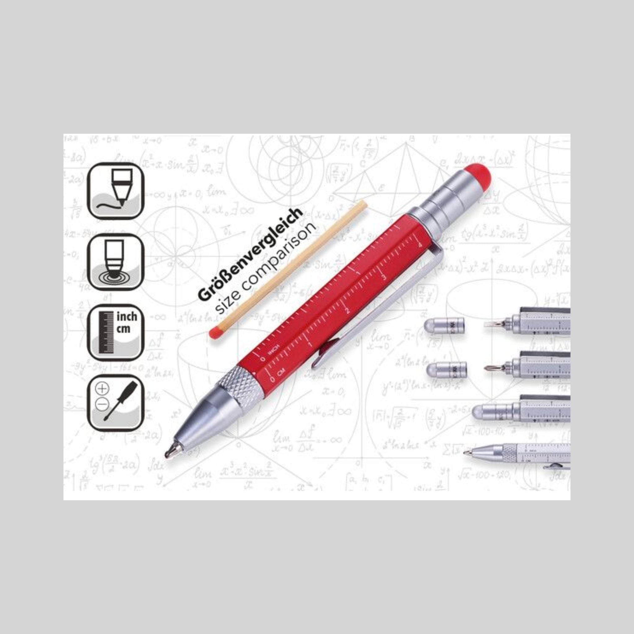 The perfect travel pen. Small and with several multitasking features. This ballpoint pen is a mini planning aid and toolbox in one - with different scales, centimetre and inch ruler, slotted/Phillips screwdriver and stylus. Fits comfortably in your wallet, wallet, shirt pocket or trouser pocket.