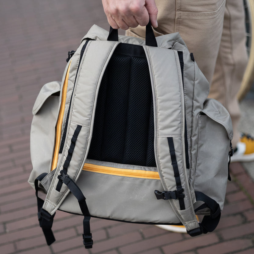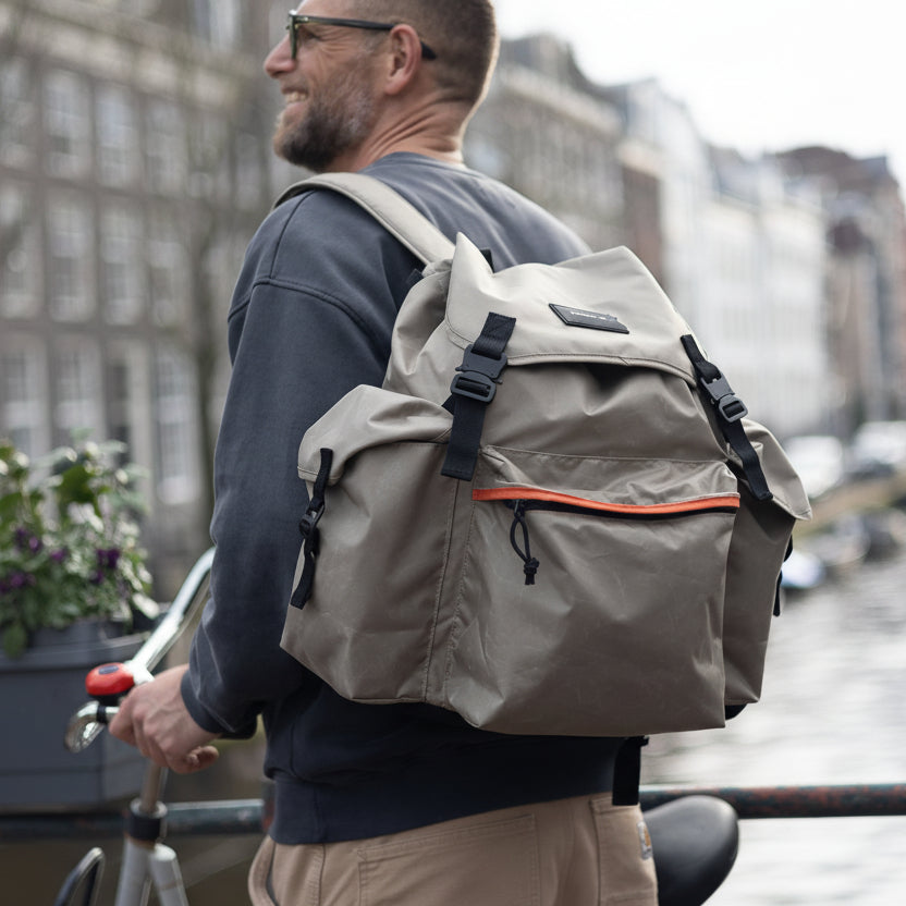 The lightweight fabric of the Josh backpack is waterproof. Just make sure you close the pockets properly, then biking through the Dutch rain is no problem : )