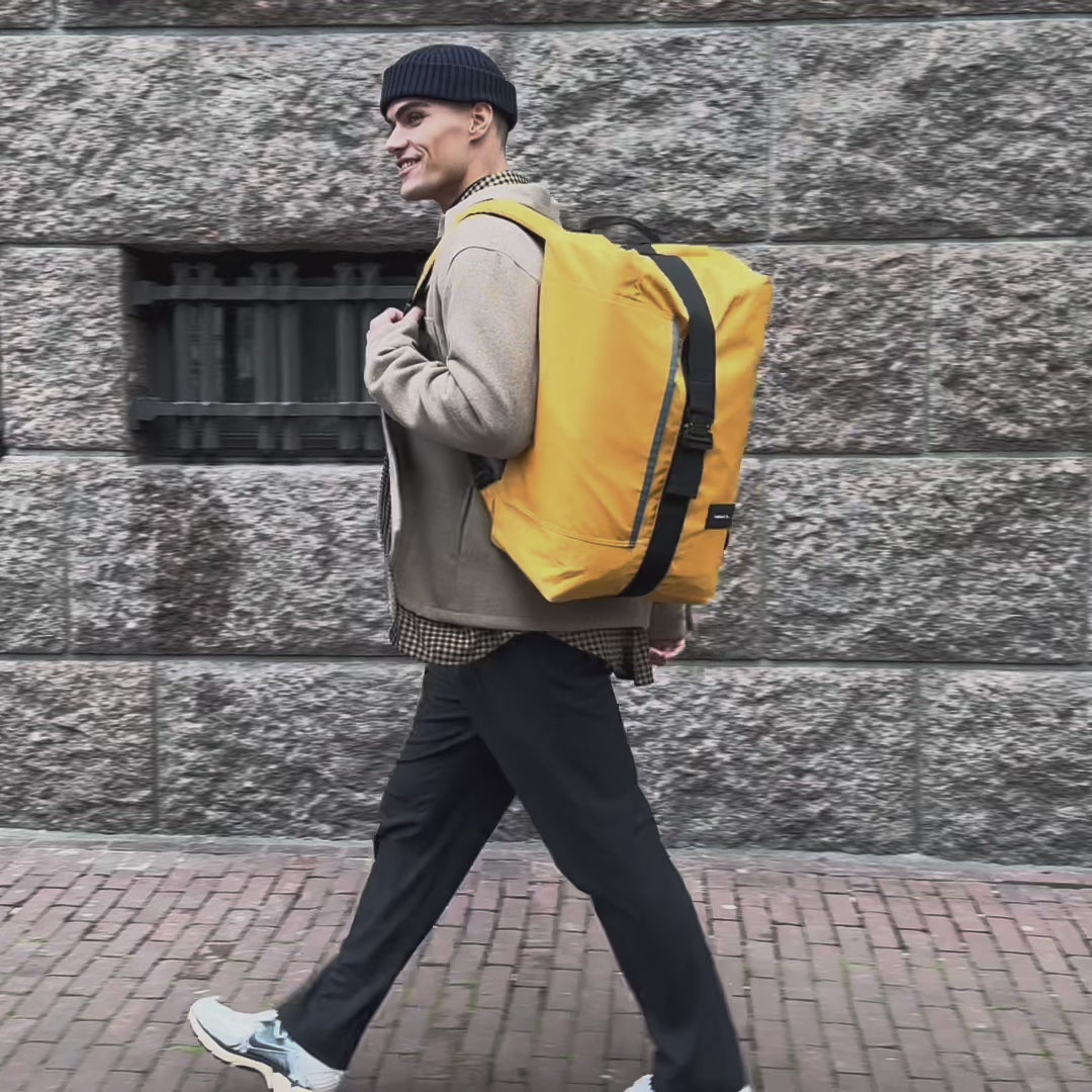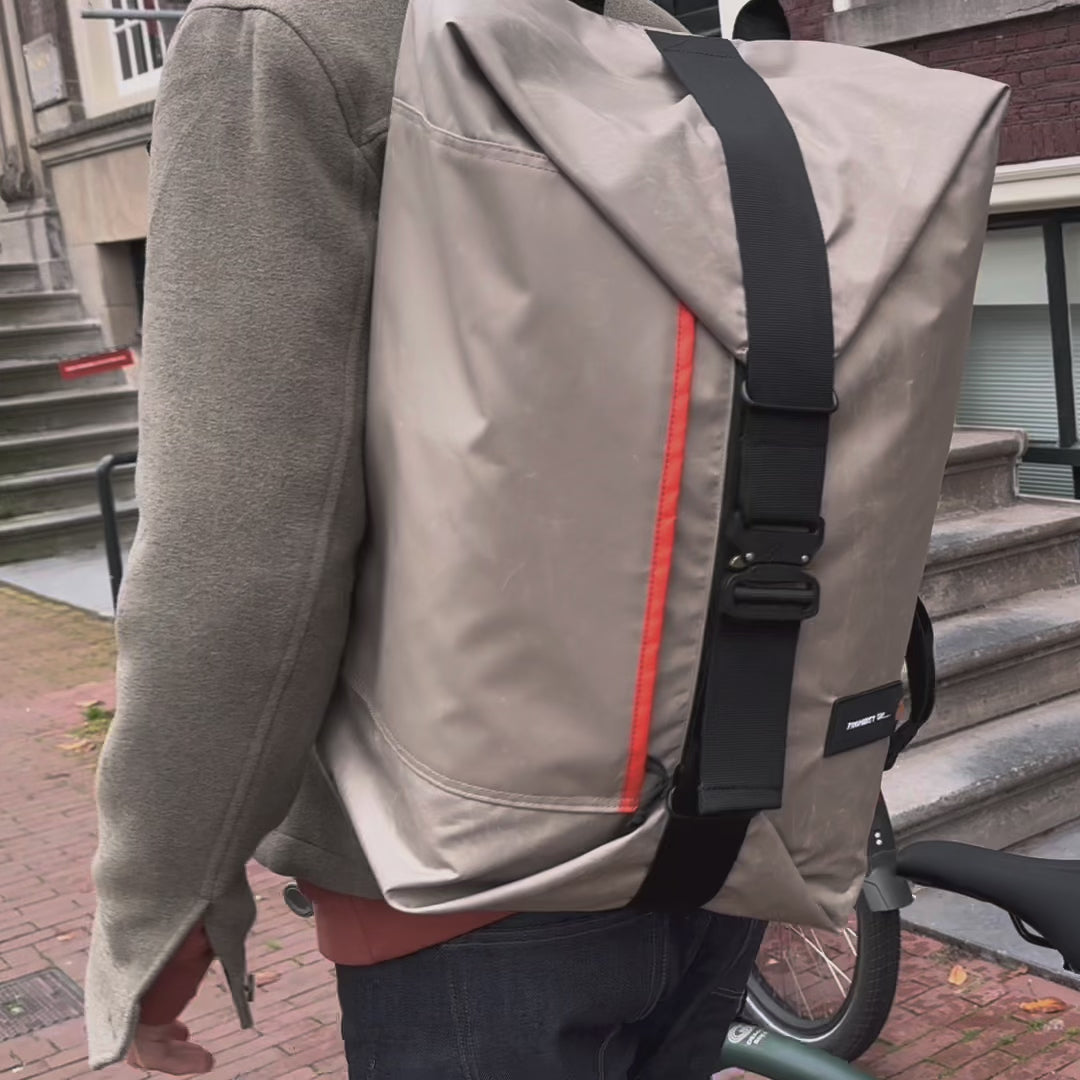 The Marco Overnight Bike Pack is a great weekend bag. It has a timeless, sporty look and takes you from the office, to the gym and for a quick weekend away. It has a padded 15" laptop compartment. The fabric is made from recycled PET bottles with a layer of wax to make it even more waterproof. To keep you safe at night, we added highly reflective strips on the back and on the shoulder straps. The Marco Overnight Bike Pack is completely vegan.