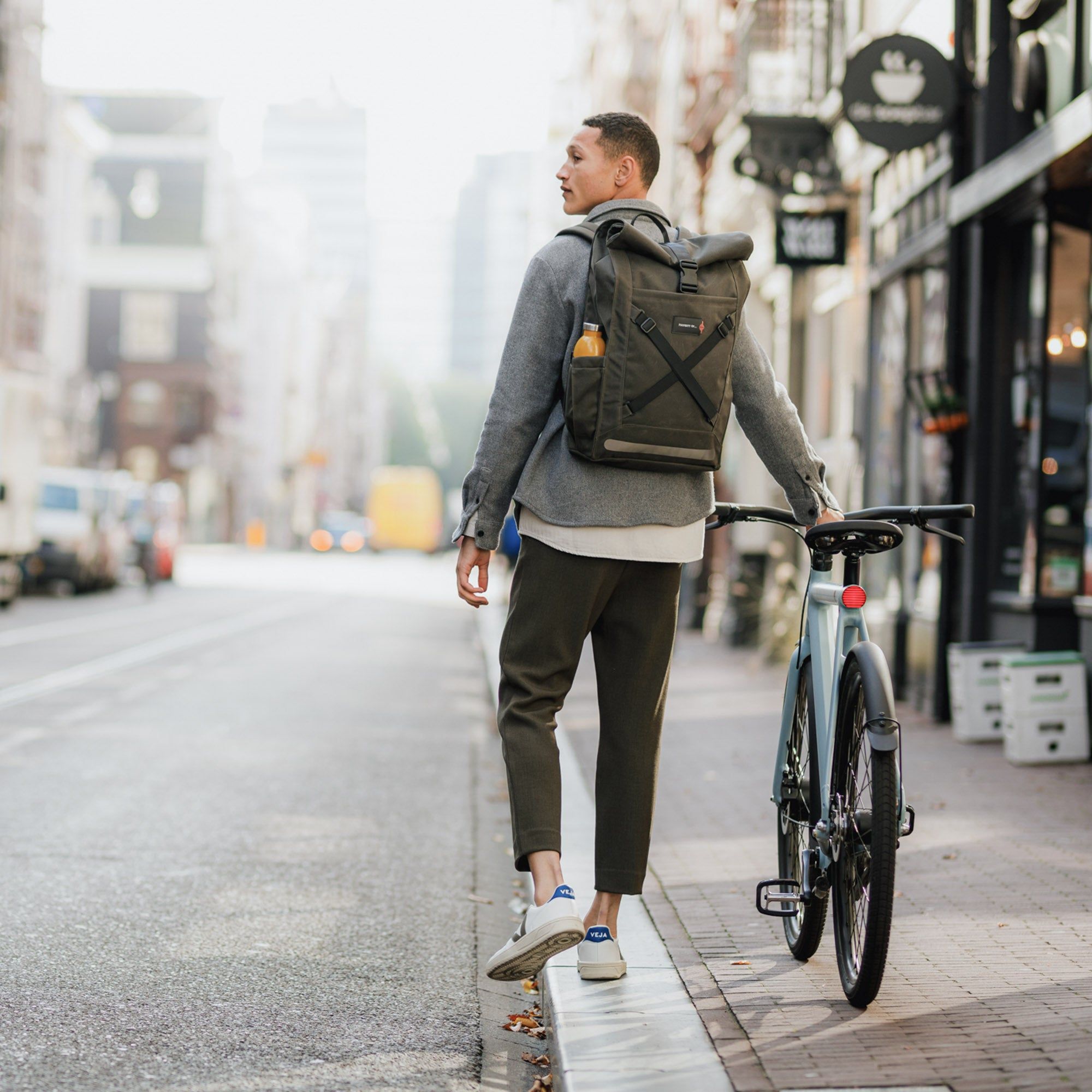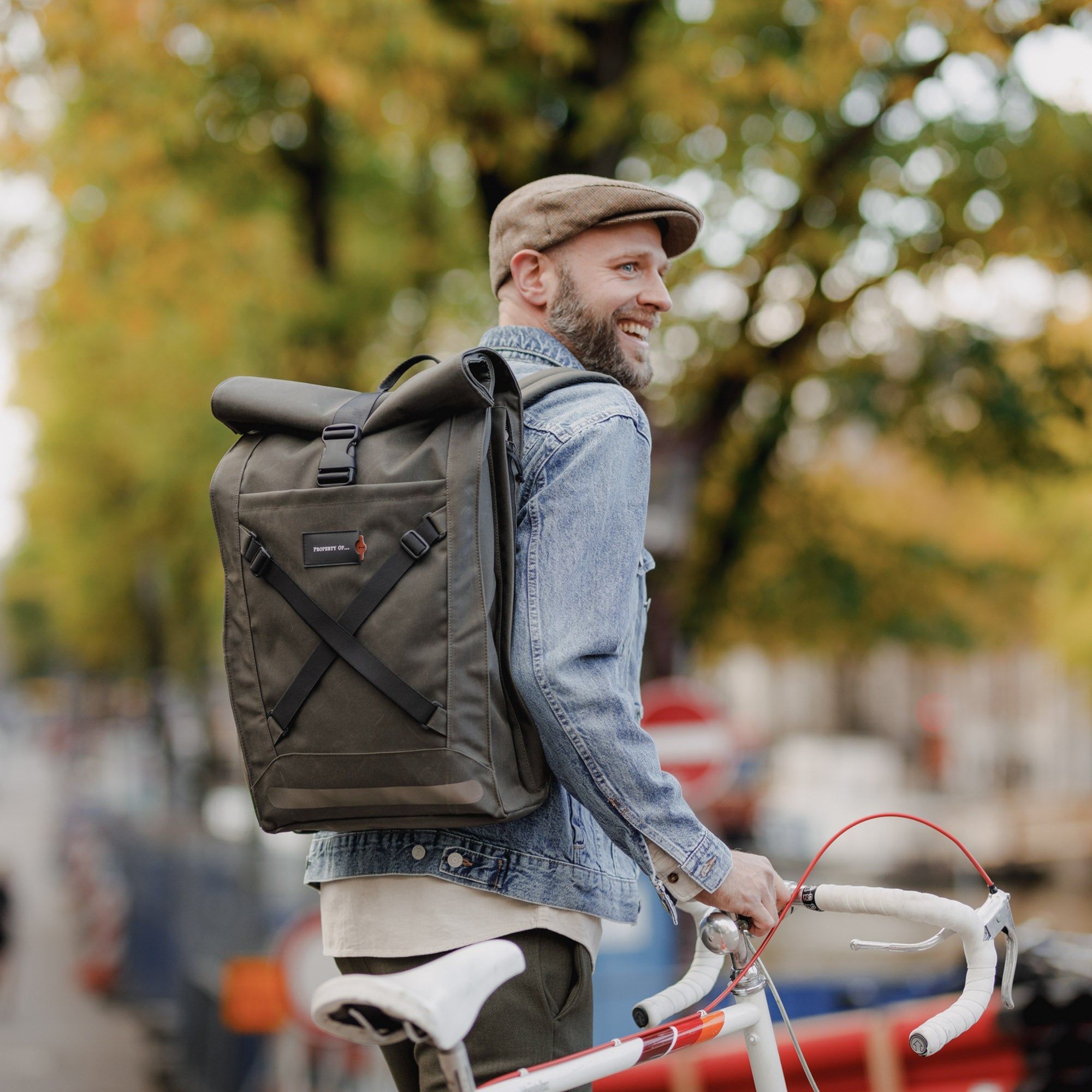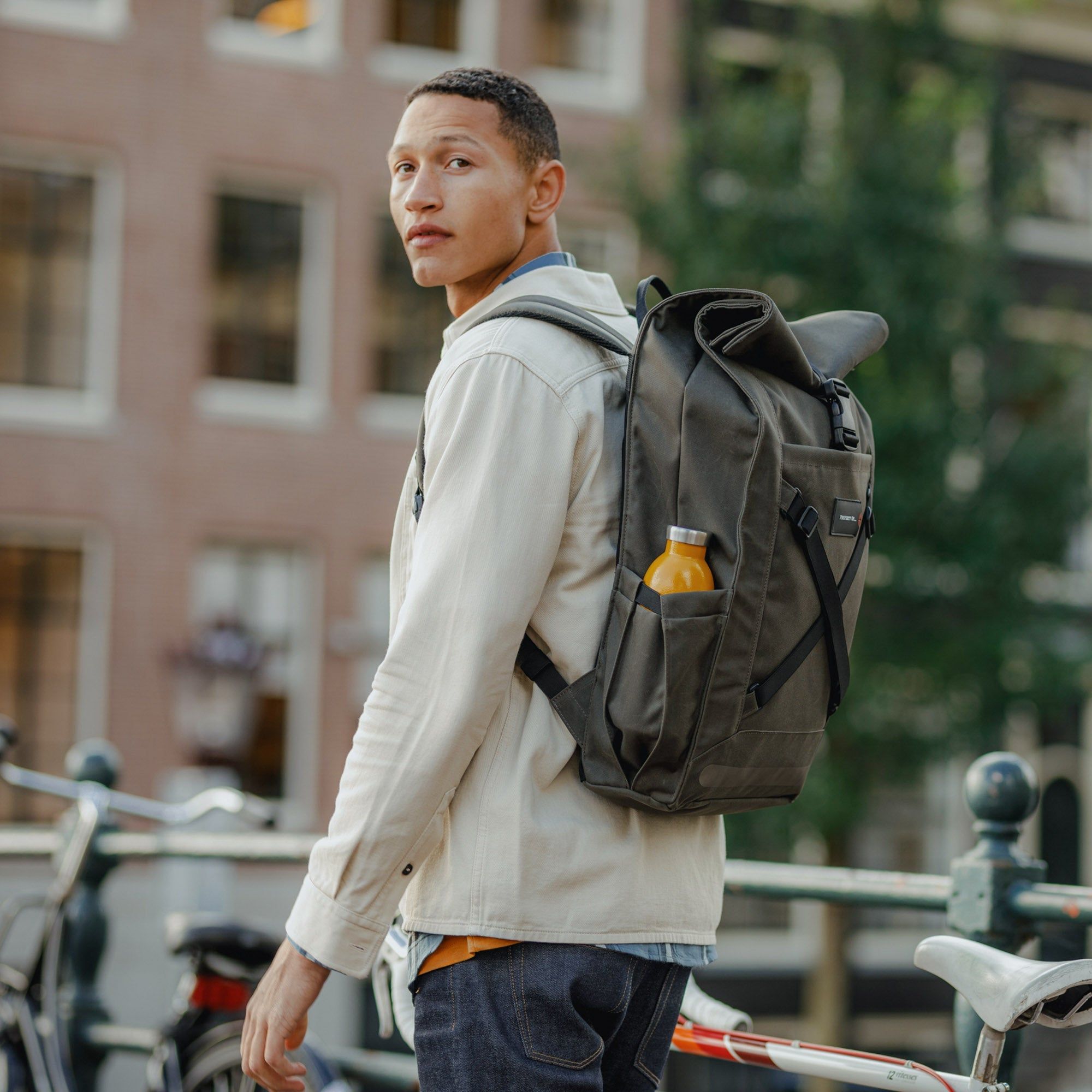 The Lenny Bike Pack is a great everyday backpack. It has a timeless, sporty look and takes you from the office, to the gym and for a quick weekend away. It has a padded 15" laptop compartment. The fabric is made from recycled PET bottles with a layer of wax to make it even more waterproof. To keep you safe at night, we added highly reflective strips on the back and on the shoulder straps. The Lenny Bike Pack (as the rest of the Amsterdam Series) is completely vegan.